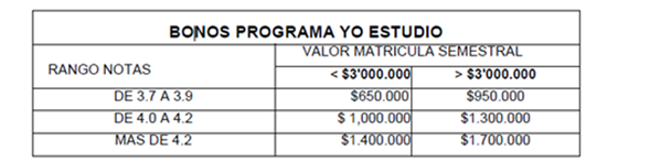 Se denomina “Yo Estudio” y es otorgado a beneficiarios cuyo promedio por desempeño académico del semestre es 3.7. Es un apoyo reembolsable por el 100% del valor de la matrícula semestral, con un tope de $3.5 millones.